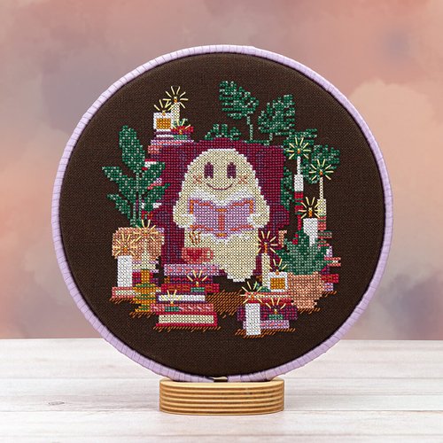 Pattern is stitched on 28-count Black Chocolate fabric using DMC floss. Stitch count is 84 wide x 93 high. Finished size is 6 in wide X 6.64 in high.