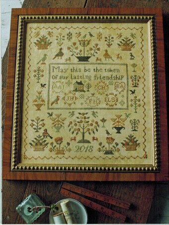 Three stitching projects celebrating friendship. "My Heart to Hold" stitched on 36 Ct. Legacy linen with Classic Colorworks floss (Balsam Fir, Camouflage, Caramel, Fool's Gold, Gingerbread, Secret Garden, Straw Hat) and Weeks Dye Works (Oak, Tarragon). Stitch Count: 131W x 78H. "Shepherd's Bush Pincushion" stitched on 36 Ct. Legacy linen with Classic Colorworks (Balsam Fir, Camouflage, Caramel, Fool's Gold, Gingerbread, Secret Garden, Straw Hat) and Weeks Dye Works (Oak, Tarragon). Stitch Count: 67W x 69H. "Our Lasting Friendship" stitched on 36 Ct. Legacy linen with Classic Colorworks floss (Balsam Fir, Brown Sugar, Camouflage, Caramel, Fool's Gold, Gingerbread, Secret Garden, Straw Hat) and Weeks Dye Works (Oak, Tarragon). Stitch Count: 201W x 225H.