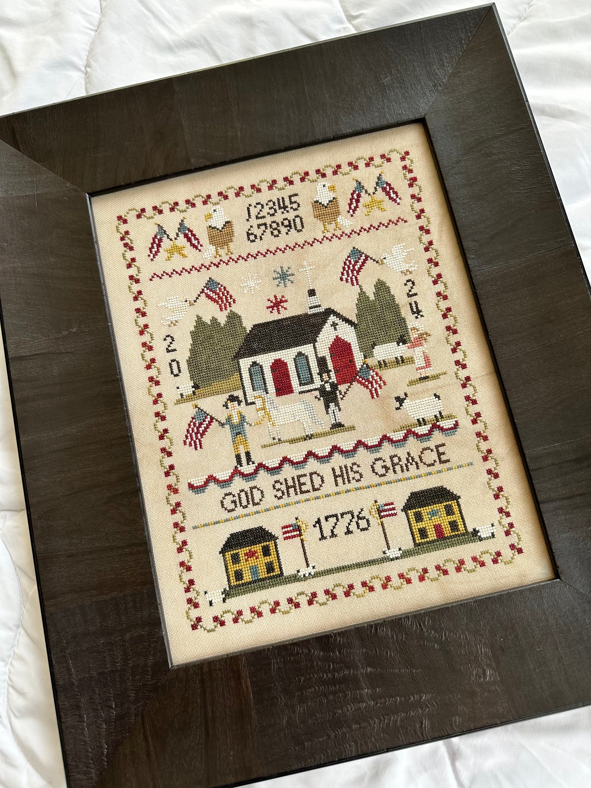 An original sampler featuring Abraham Lincoln and George Washington in a more primitive design centered around history and an old white chapel reminding us of God’s Grace.