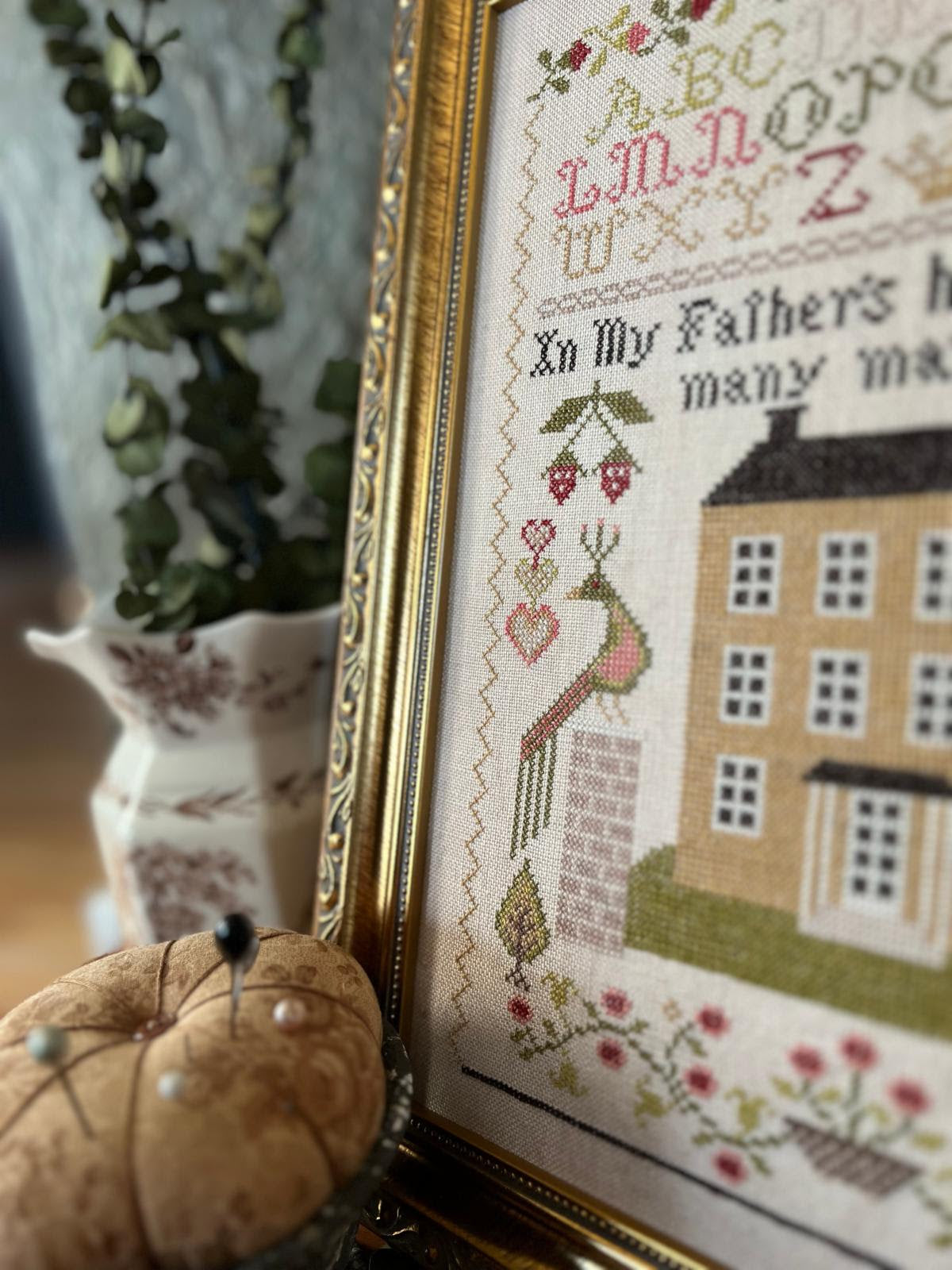 The model was stitched on 36 count Dolly Madison linen from Needle and Flax, using 1 strand of floss over 2 linen threads. Threads used are DMC.