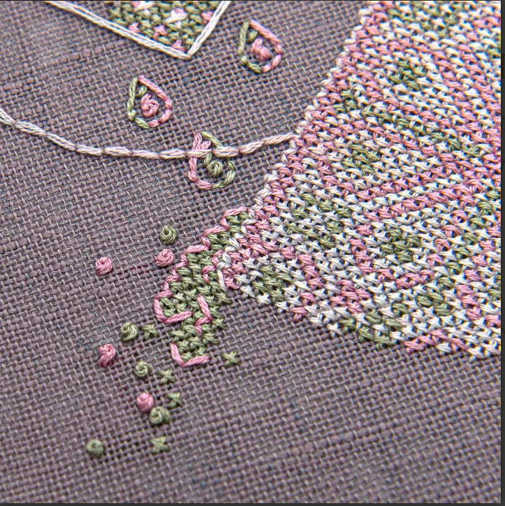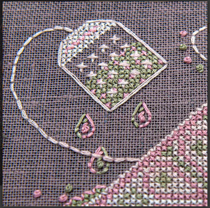 Sample: The photographed sample was stitched on 28-count French Country Purple Linen by Wichelt, using Treenway Silks floss and mounted in a 6-inch embroidery hoop.