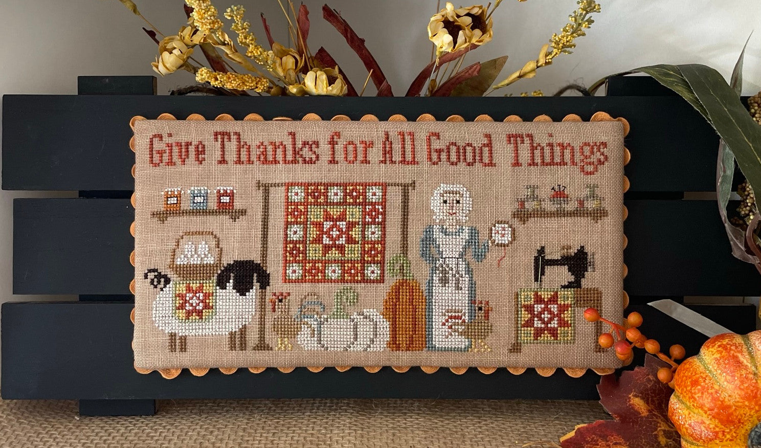 Cross Stitch pattern from Mani Di Dona featuring a woman quilting in the fall!