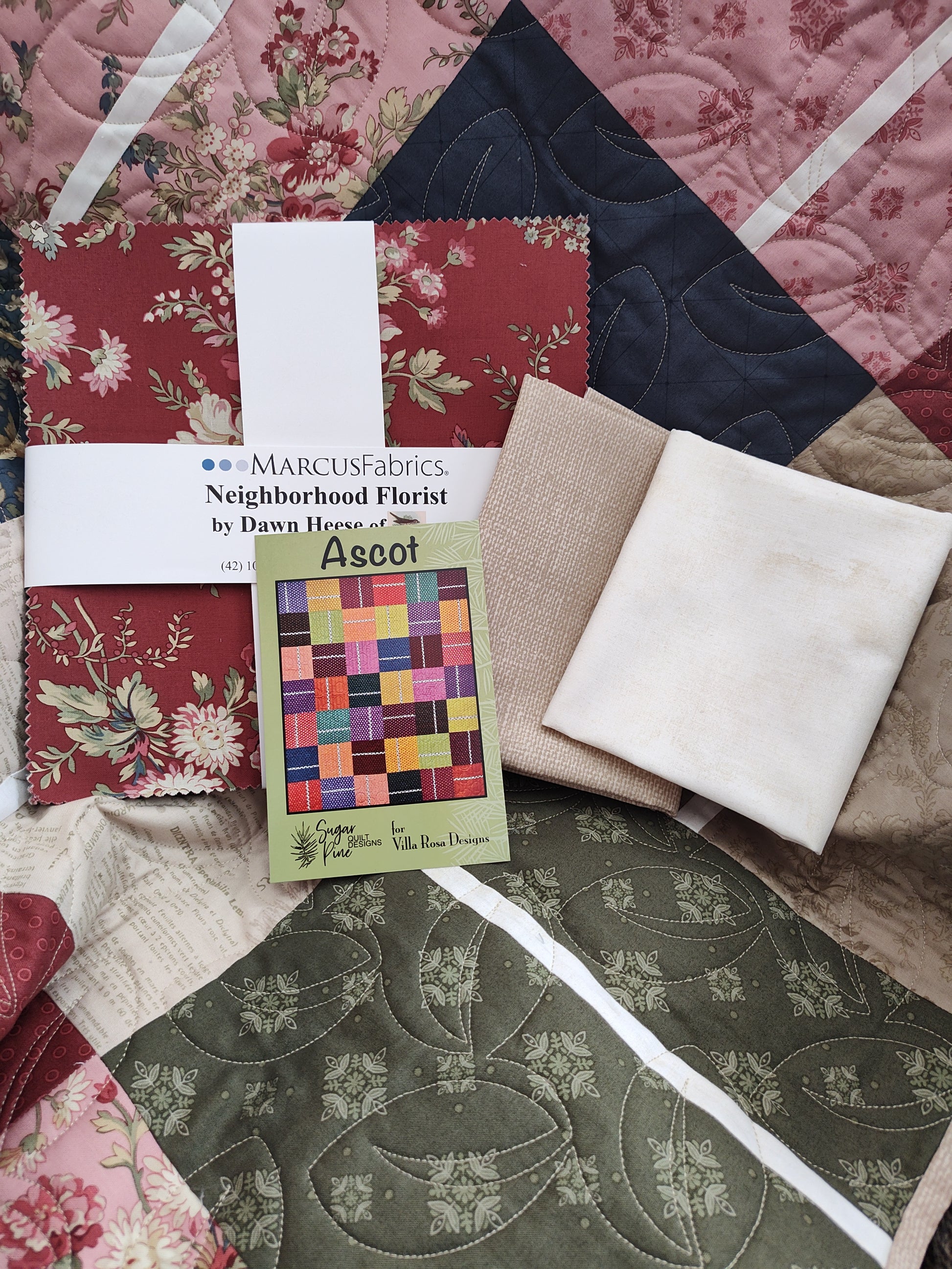 Kit includes: Neighborhood Florist by Dawn Hesse for Marcus Fabrics - Cotton Fabrics - 10"x10" Squares; 42 pieces (includes duplicates); Pattern "Ascot" by Sugar Pine Quilt Designs and enough Fabric for Borders and Binding!! (Backing Not Included)