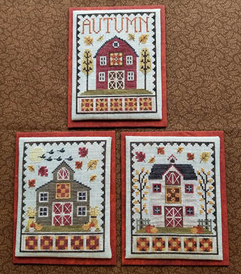 Cross stitch pattern from Waxing Moon Designs featuring three autumn barns!