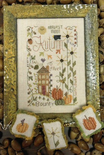 Model stitched over two threads on 32 Ct. Flax Linen using Weeks Dye Works and Classic Colorworks floss (or DMC 3045, 613, 221, 839, 612, 976, 434, 3011, 3740, 301, 3012, 936). Stitch Count: 49x76. Design Size: 3" x 5". Shown with buttons from Just Another Button Company.