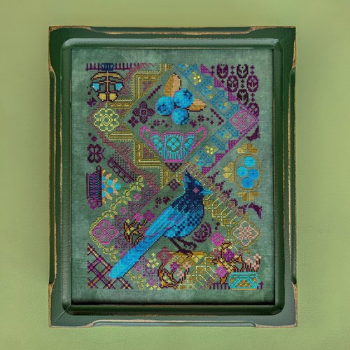 Cross stitch pattern from JEDxStitch featuring a blue and purple themed geometric design with a blue jay and blueberries!