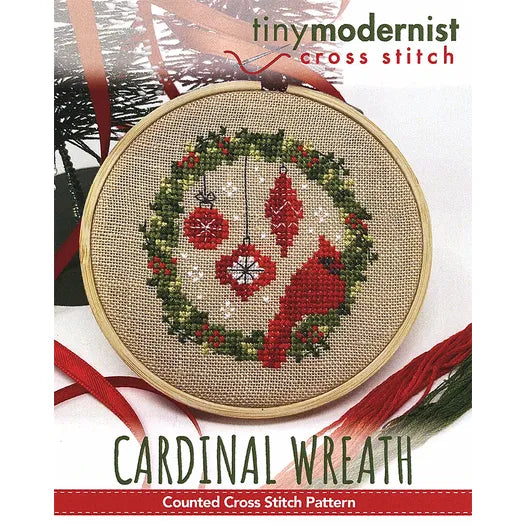 Cross stitch pattern from Tiny Modernist featuring an adorable cardinal surrounded by a Christmas wreath!