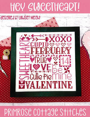 Cross stitch pattern from Primrose Cottage Stitches featuring a design filled with Valentines phrases for your sweetheart!