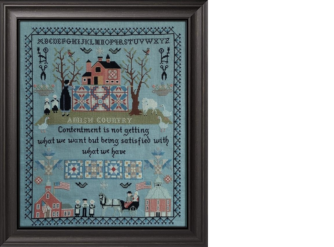 Cross stitch pattern from Twin Peak Primitives featuring quilts and "Contentment is not getting what we want but being satisfied with what we have."