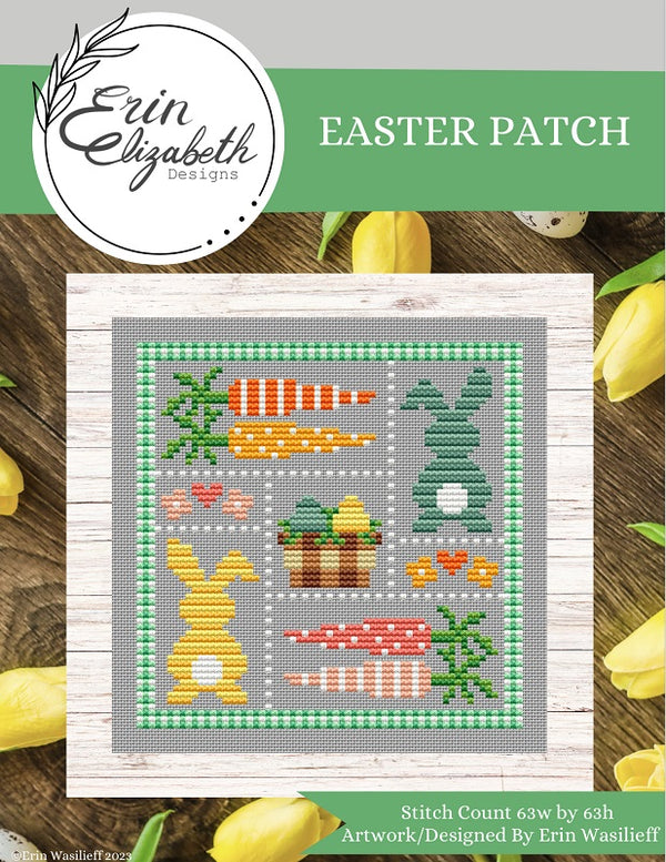 Cross stitch pattern from Erin Elizabeth featuring a handful of squares with Easter bunnies and carrots!
