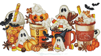 Ghosts, bats and pumpkins decorate 4 tasty cups of coffee in this pattern from Les Petites Croix De Lucie.