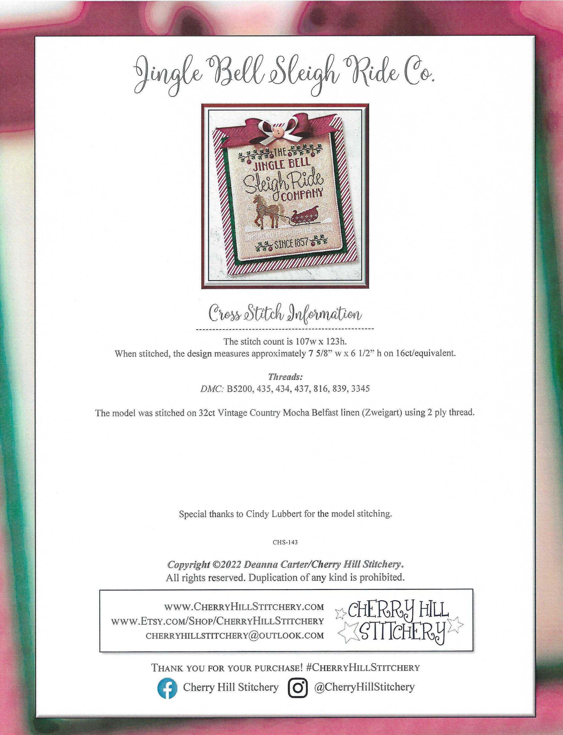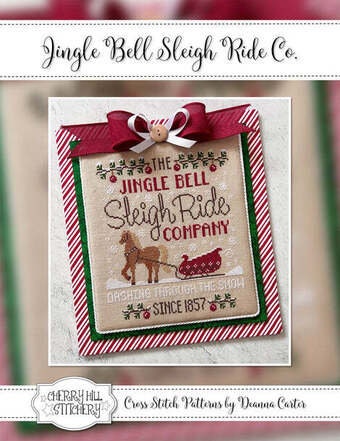 Embrace the holiday spirit with this enchanting cross stitch pattern from Cherry Hill Stitchery, showcasing a horse-drawn sleigh and the festive phrase "Jingle bell sleigh ride company" to brighten your seasonal decor.