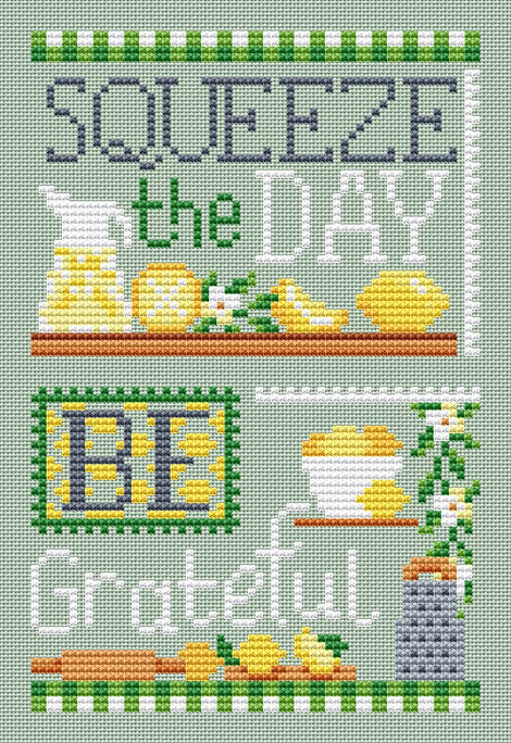 Two patterns from Erin Elizabeth - "Squeeze the Day" with lemonade and "Be Grateful" with lemons and a grater.