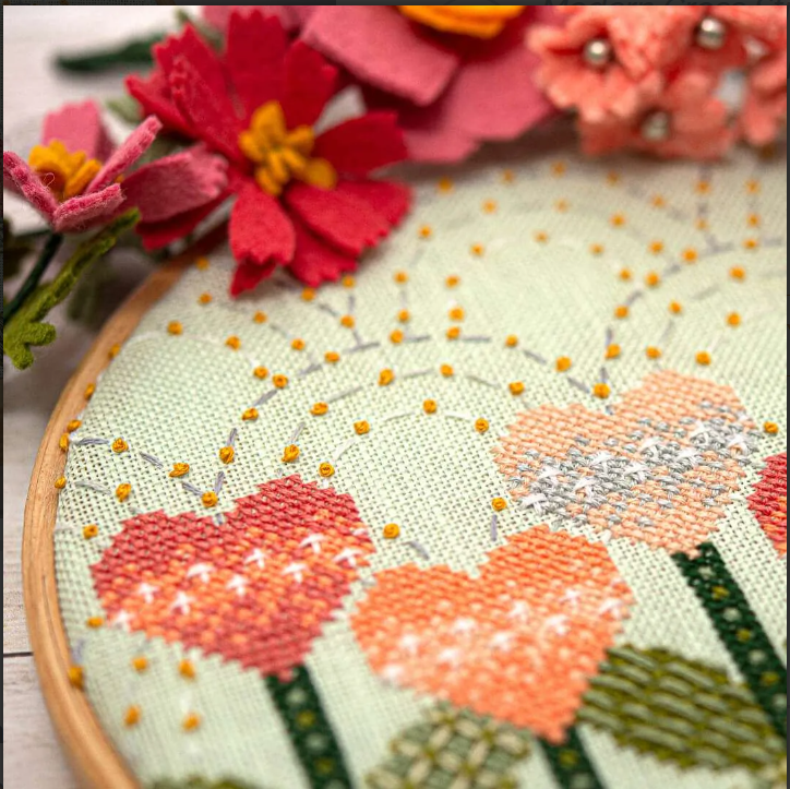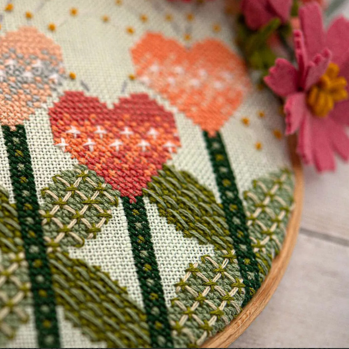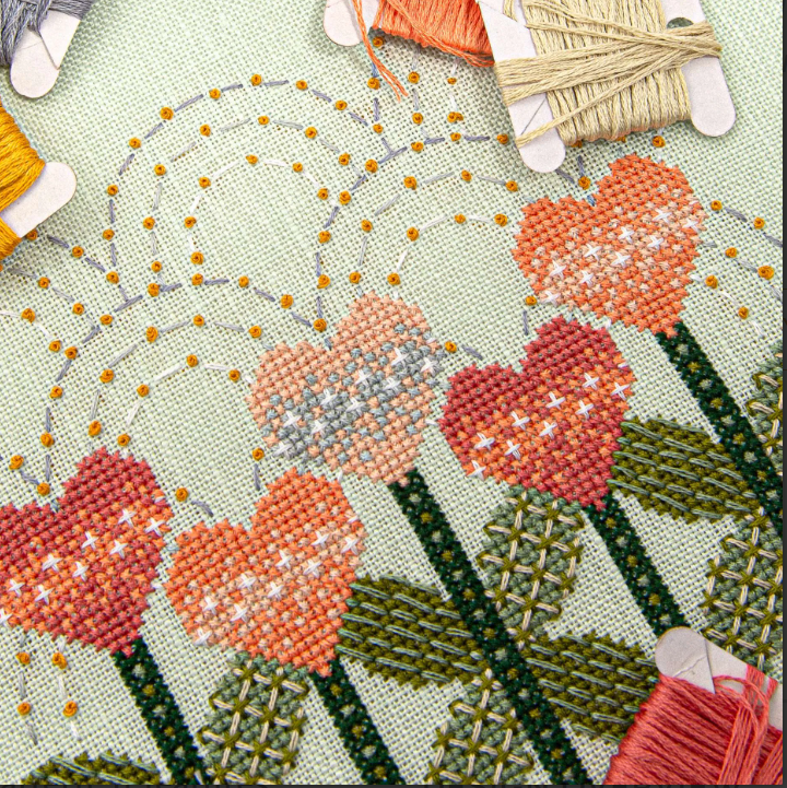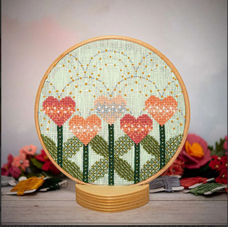 Love Blooms year round with this sweet modern cross stitch pattern. It features flowers shaped like hearts, happy arches in the background, symmetrical shapes in the leaves, and lots of texture added with back stitch, straight stitch, St. George's Crosses, and French knots.