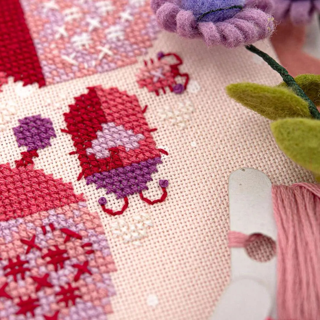 Feel the love this Valentines day with this collection of cute lovebugs. They feature hearts, Xs and Os, and are playfully arranged into an iconic heart shape. Enjoy the use of cross stitch, back/straight stitch, and French knots on this modern cross stitch pattern.