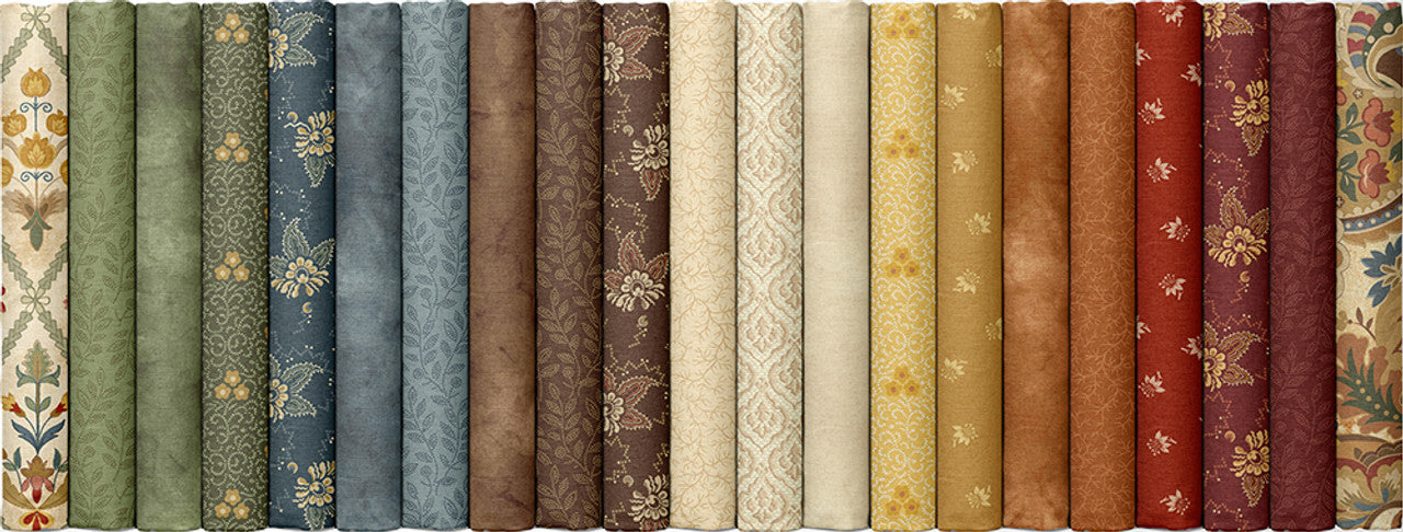 This fabric collection, designed by Missie Carpenter, features intricate and elegant patterns that evoke a sense of nostalgia with its rich, vintage-inspired floral and paisley designs. The warm tones of gold, red, and green are beautifully interwoven, creating a timeless aesthetic perfect for quilting, crafting, or any sewing project that requires a touch of classic charm.