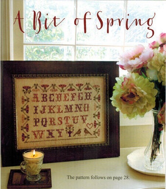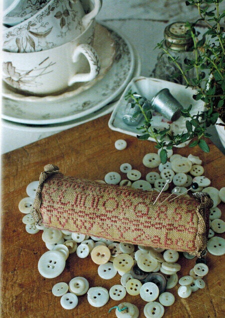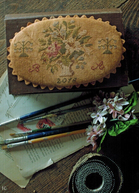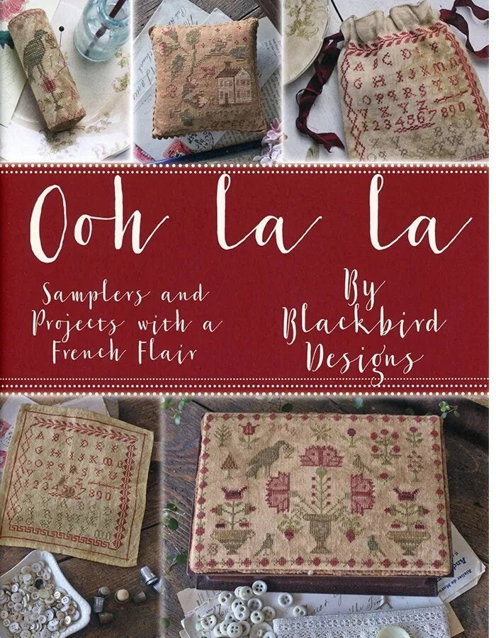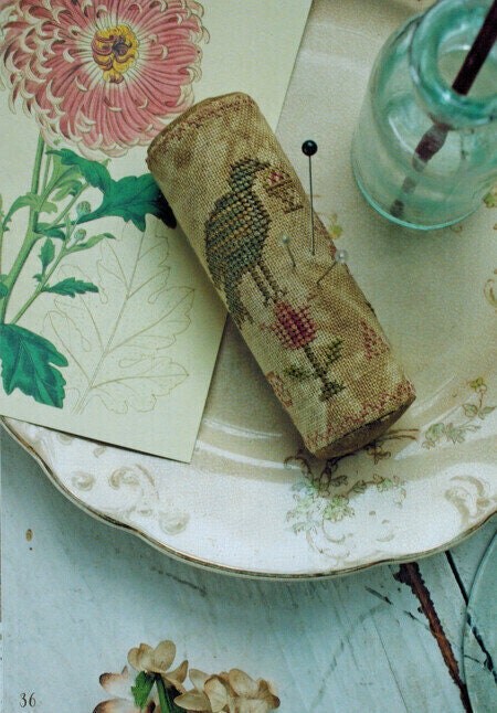 15 patterns with a French flair. "Ma Chere Louise", "Mon Petit Examplair", "Mon Petite Examplair Sewing Bag", "Le Poulet Pincushion", "Sidonie's Petit Chien, Sidonie's Petite Chien Drum Pincushion", "A Little Bit French", "A Little Bit French Pinroll", "Deux Oiseaux", "A Bit of Spring", "Her Fair Works - A Sewing Box", "Her Fair Works - Mattress Pincushion", "The Budding Twigs - Pinroll", "The Last Rose of Summer Sewing Box" and "Spring Green Pincushion."