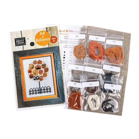 Pop of Halloween Zipper Cross Stitch Kit by Bent Creek includes 20ct Linen cross stitch cloth and nine DMC Pearl Cotton floss colors.