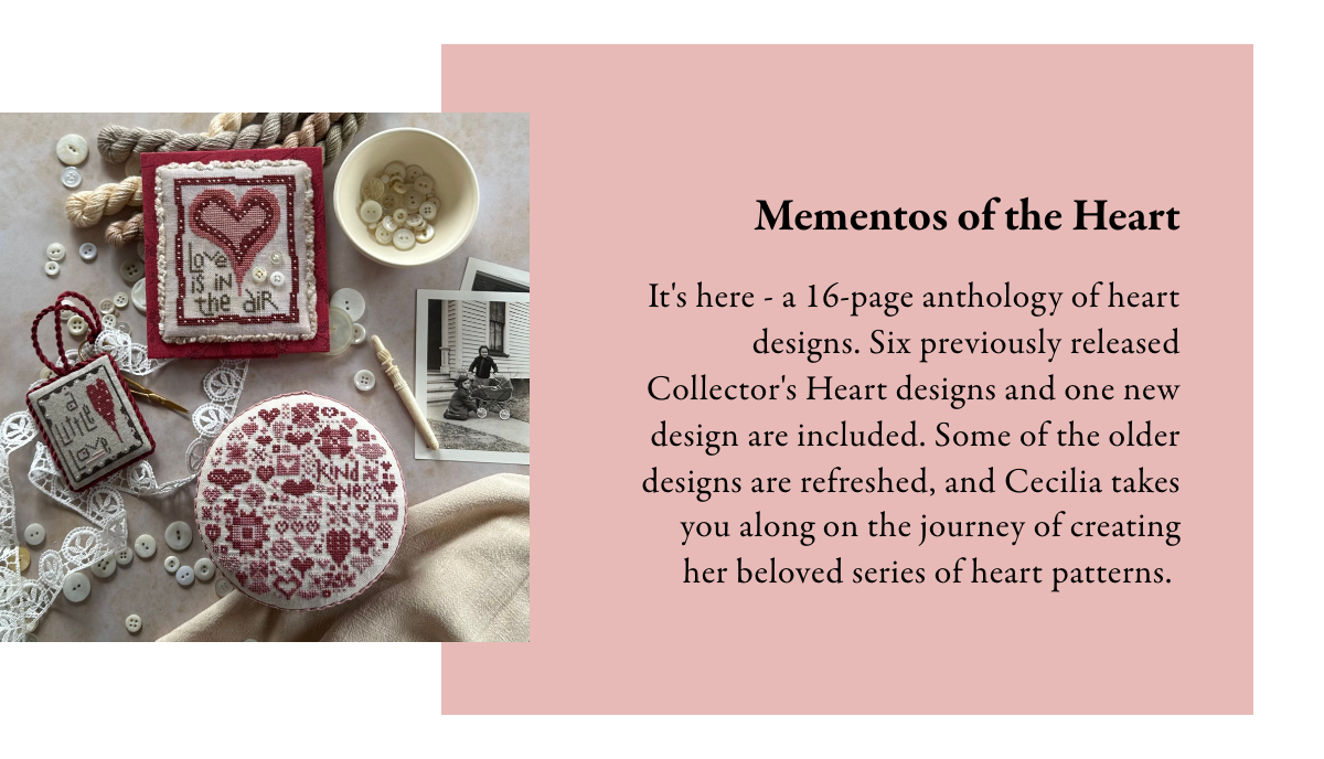 A 16-page anthology which includes 6 previously released Collector’s Heart designs. Never published as chart-only, this volume includes Collector’s Hearts from 2002, 2006, 2008, 2010, 2011 and 2013. Some of the designs are refreshed with different finishes, or new thread palettes. There is also one new design: the Kindness Drum. Extensive notes are included from Cecilia on the evolution of the series. Lots of photos and quotations make this volume much more than just a book of patterns.