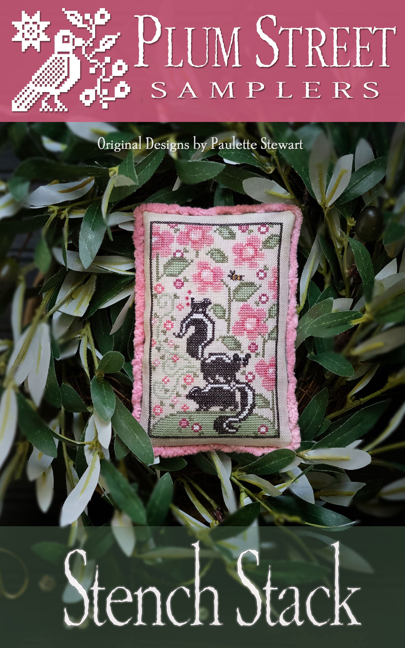 Threads used: WDW in Mascara, Collards, Camellia, and Whitewash; CC in Secondhand Rose; DMC in 435, 522, 3688, 3731, 3803, and 844.