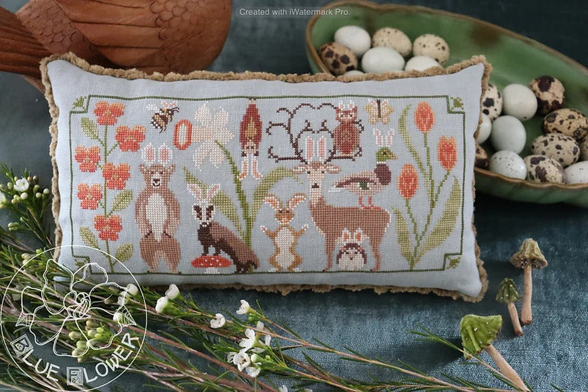 Cross stitch pattern from The Blue Flower featuring forest animals wearing rabbit ears!