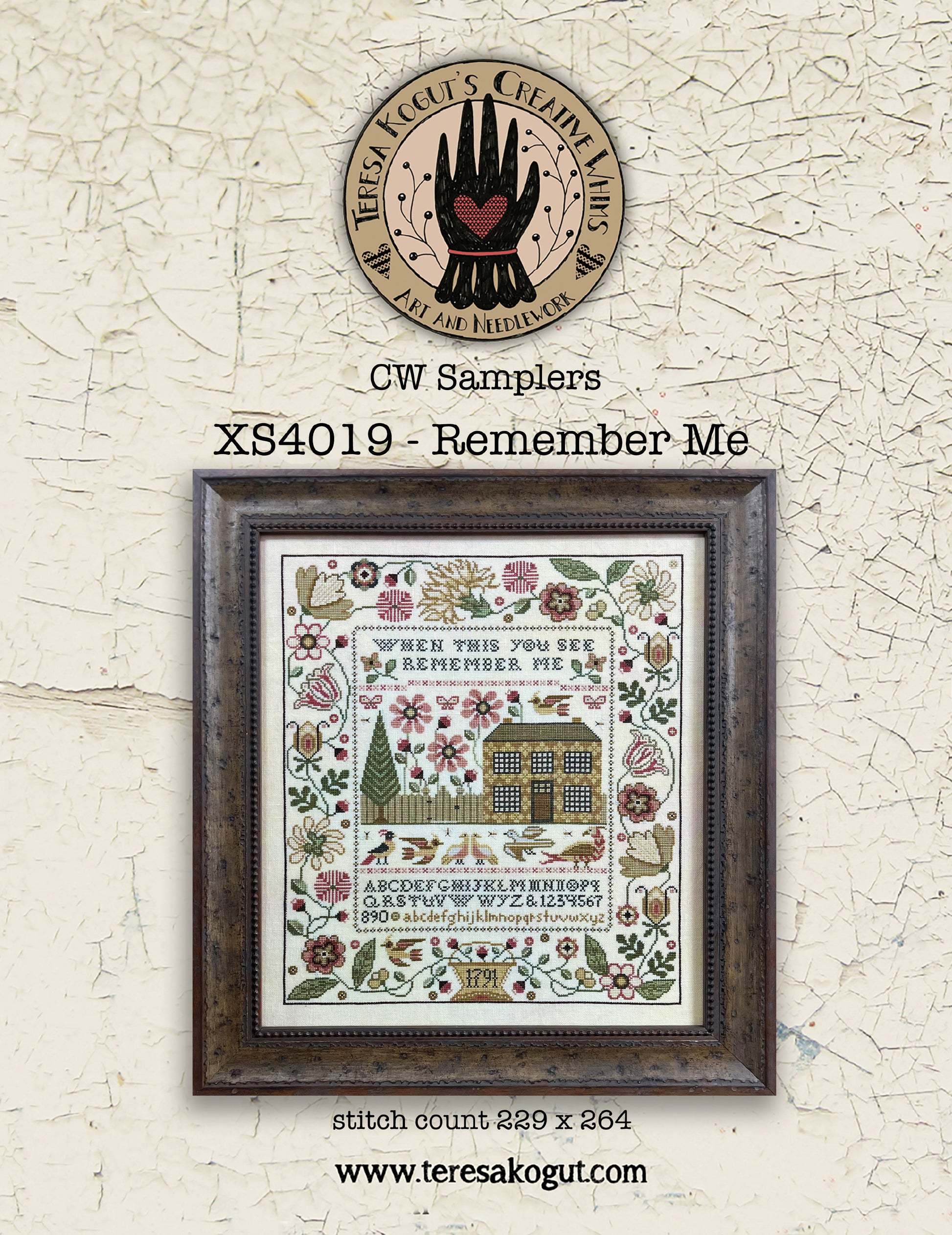 This sampler design from Teresa Kogut features flowers, a house and "When this you see, remember me."