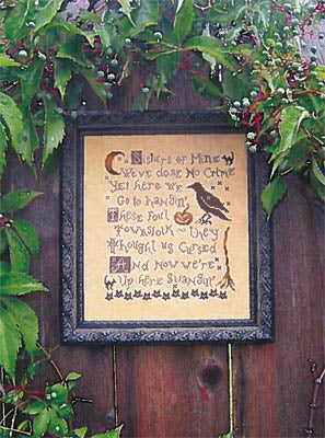 This model was stitched on 36 ct. Vintage Autumn Gold with Crescent Colours floss. The verse reads: "Sisters of mine, we've done no crime, yet here we go to hangin'. These foul townsfolk, they thought us cursed, and now we're up here swangin'."