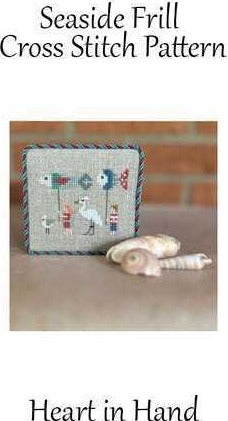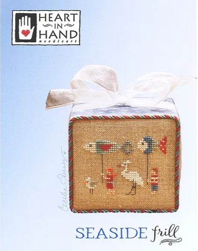 Cross stitch pattern from Heart in Hand Needleart featuring kids at the beach holding fishy balloon while walking with seagulls!