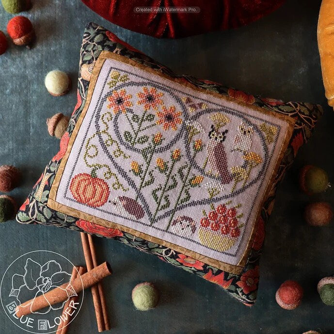 This is the third entry in the "Seasons Of The Heart" series. The series is based on a heart-shaped frame surrounded with seasonal plants and animals. For autumn, the design features hedgehogs and owls, along with corn, apples, pumpkins, etc.
