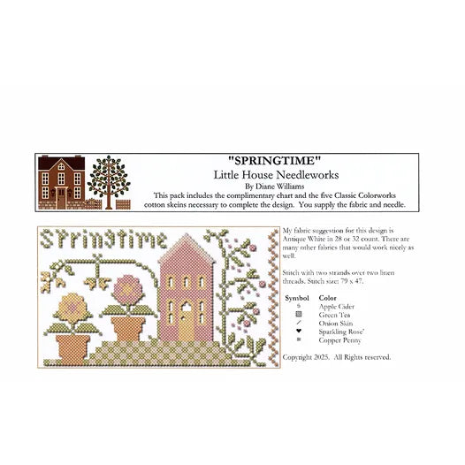 Springtime Cross Stitch Pattern by Little House Needleworks includes five skeins of Classic Colorworks 6-strand hand-dyed embroidery floss (5 yards each), including three new skeins from The 2025 Nashville Needlework Market.