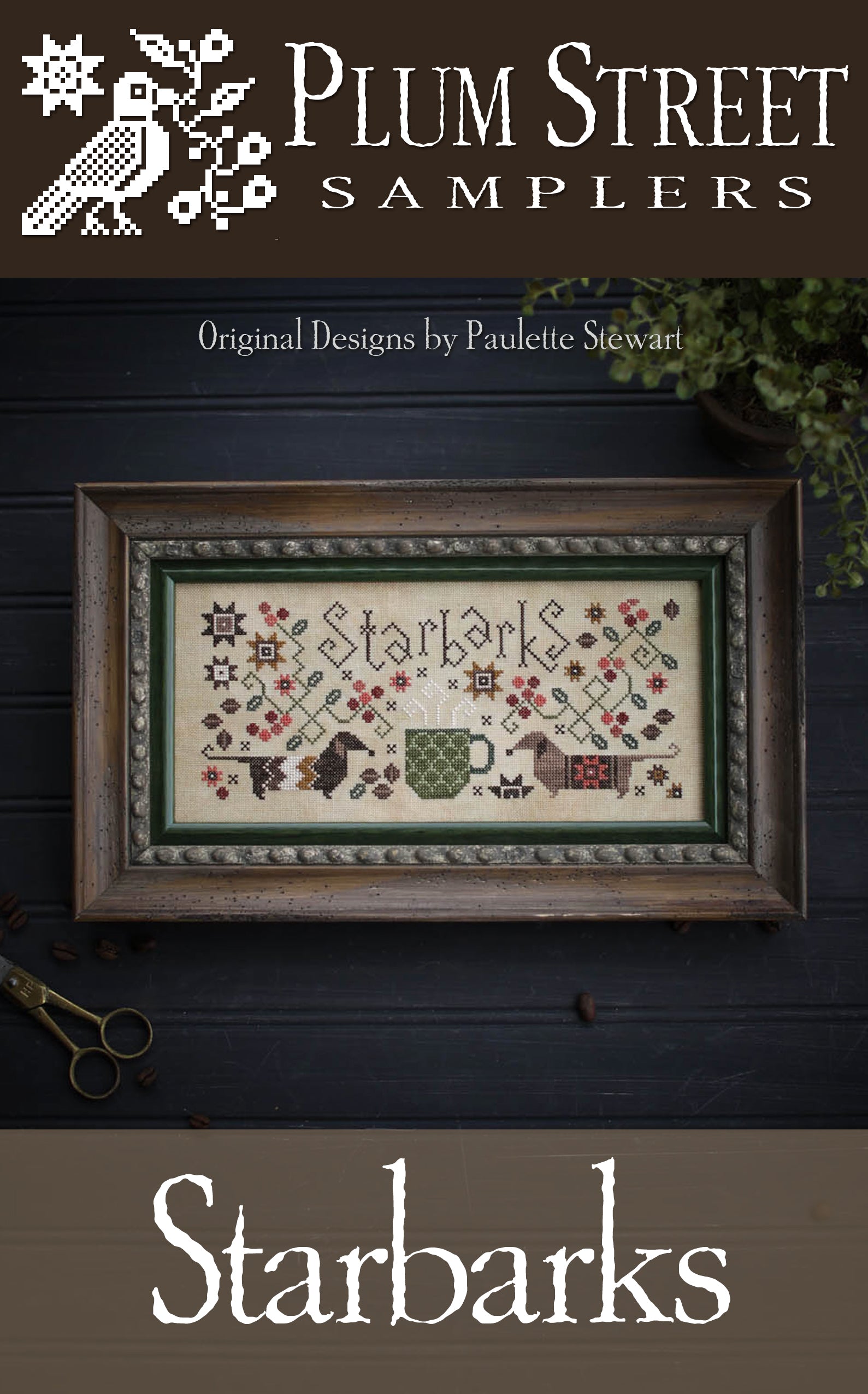 This pattern from Plum Street Samplers features two dogs in sweaters and a coffee cup!