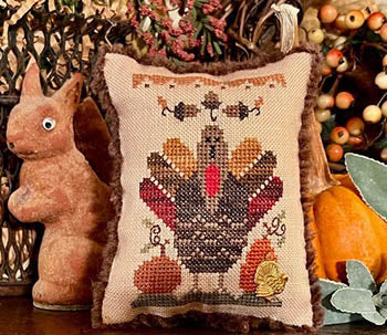 Cross stitch pattern from Homespun Elegance Ltd featuring a colorful Thanksgiving turkey!