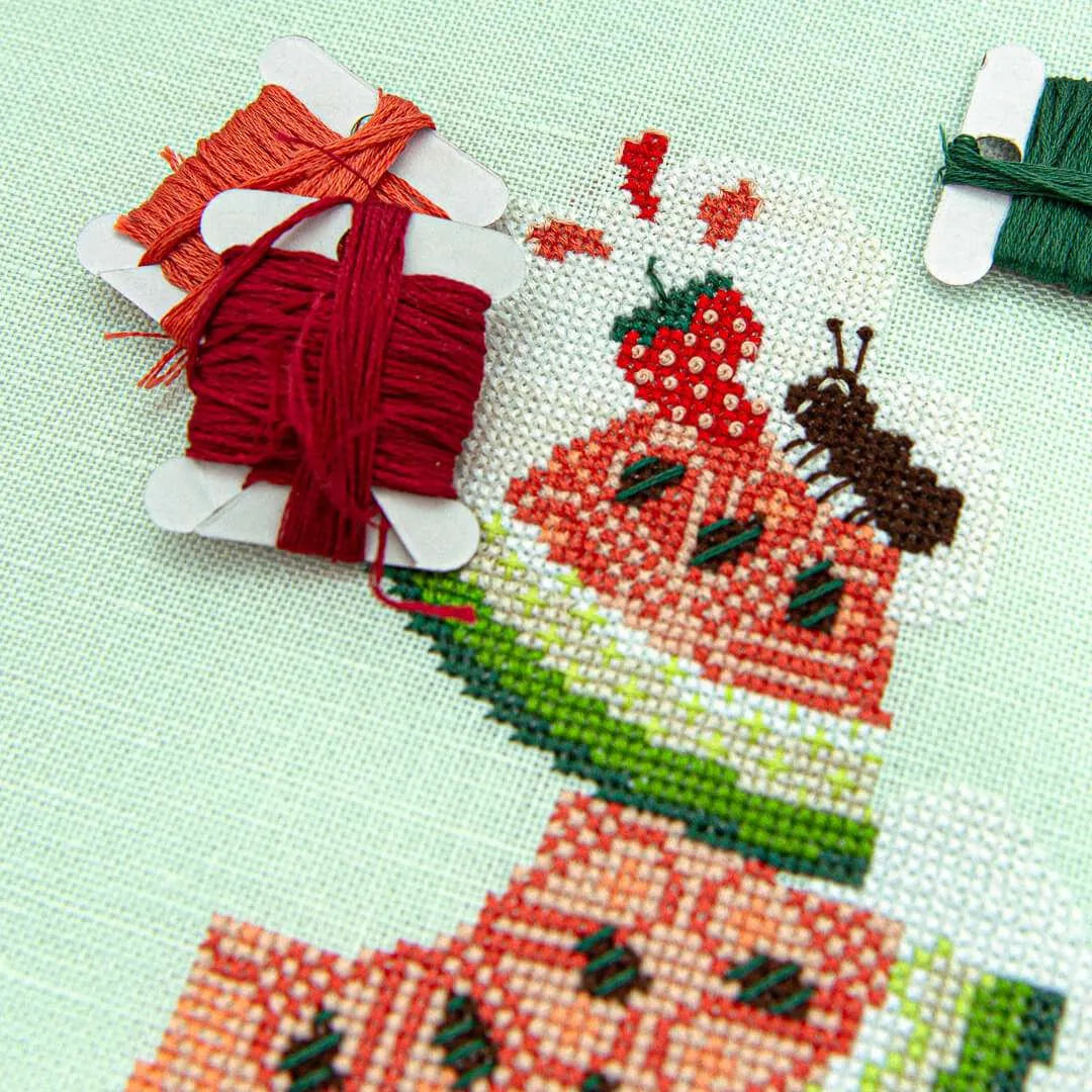 These happy picnic bandits found something sweet! This cute modern cross stitch pattern features ants carrying a mountain of tasty watermelon, along with some strawberries and cherries on their merry way back to their colony. Texture is added with back/straight stitches, St. George's Crosses, and French knots.