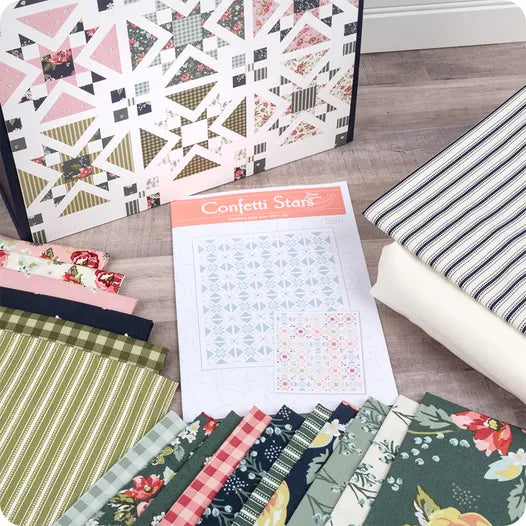 Go for a moonlight walk in the garden! Kit includes the Confetti Stars Quilt Pattern by Wendy Sheppard, Confetti Cottons and Bellissimo Gardens by My Mind's Eye fabrics for the 69" x 82" quilt top and binding, all packaged in a 11" x 12" x 3.5" keepsake box.