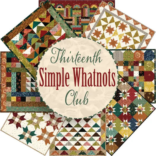Join the Thirteenth Simple Whatnots Club and make a miniature quilt each month using Kim Diehl's Quiet Grace fabric collection. Each month you will receive a pattern and fabric to complete a miniature quilt and binding.