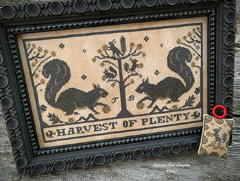 Cross stitch pattern from Scattered Seed Samplers featuring two autumn squirrels with the phrase "Harvest of plenty"!